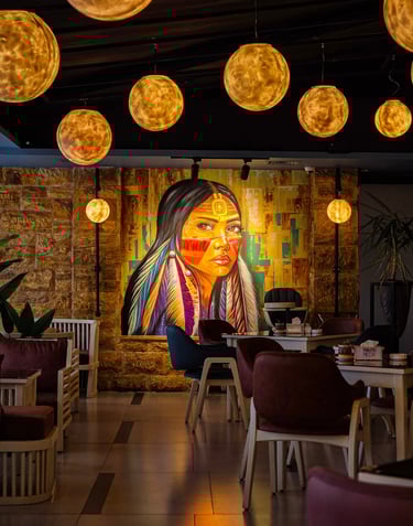 Our carefully curated artwork blends natural textures with cultural storytelling, immersing you in an environment where every detail is a visual journey. The soft lighting, warm colors, and inviting seating make it the perfect spot to enjoy your coffee while surrounded by art that celebrates history, nature, and adventure.