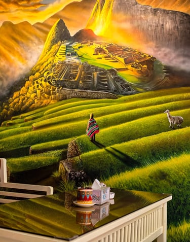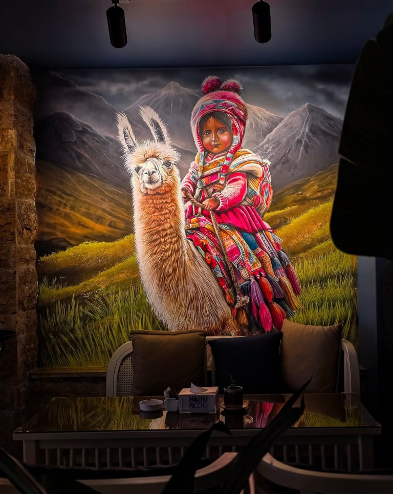 Step into the vibrant world of Machu Picchu Café, where every corner tells a story inspired by the rich heritage of the Inca civilization in Peru. The walls come alive with hand-painted murals of majestic llamas, Andean landscapes, and colorful traditional attire, creating a captivating atmosphere that transports you across continents.