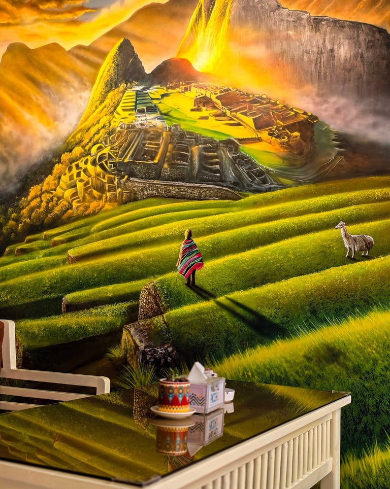 Every detail tells a story. From the ancient agricultural terraces that once sustained the Inca, to the graceful llamas roaming the vibrant fields, and the traditional colorful garments that celebrate the rich heritage of the Andes, each painting immerses you in a world of wonder. These murals are not merely visual art—they are a sensory journey, transporting you to a realm of culture, history, and natural beauty as you sip your favorite drink.